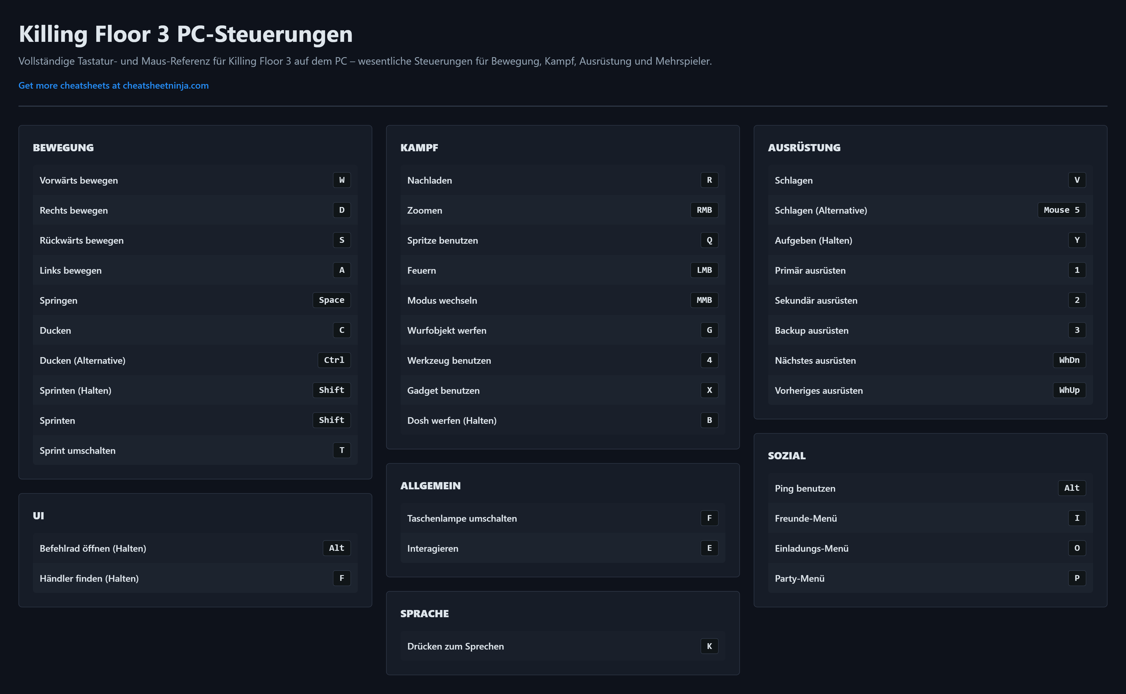 Vollständige Tastatur‑ und Maus‑Referenz für Killing Floor 3 auf dem PC – wesentliche Steuerungen für Bewegung, Kampf, Ausrüstung und Mehrspieler.