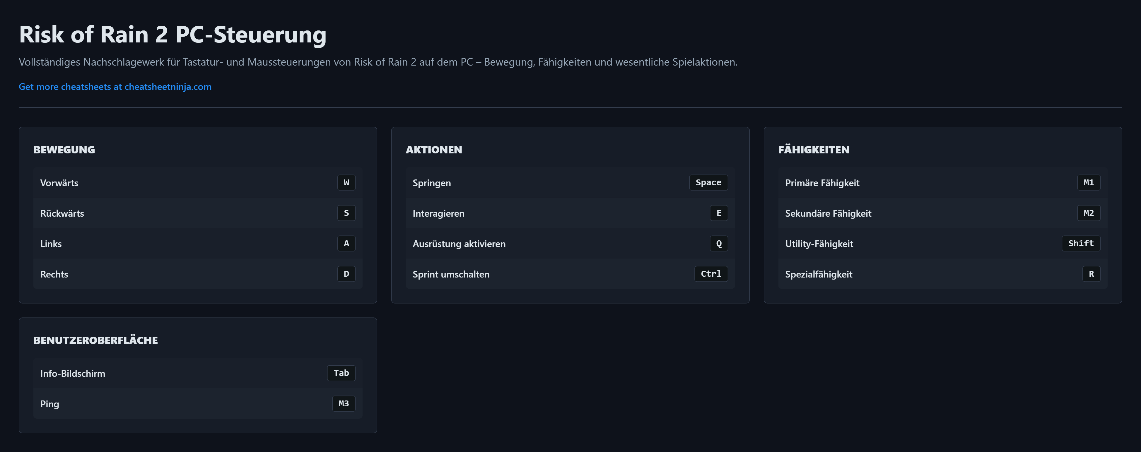 Vollständiges Nachschlagewerk für Tastatur‑ und Maussteuerungen von Risk of Rain 2 auf dem PC – Bewegung, Fähigkeiten und wesentliche Spielaktionen.