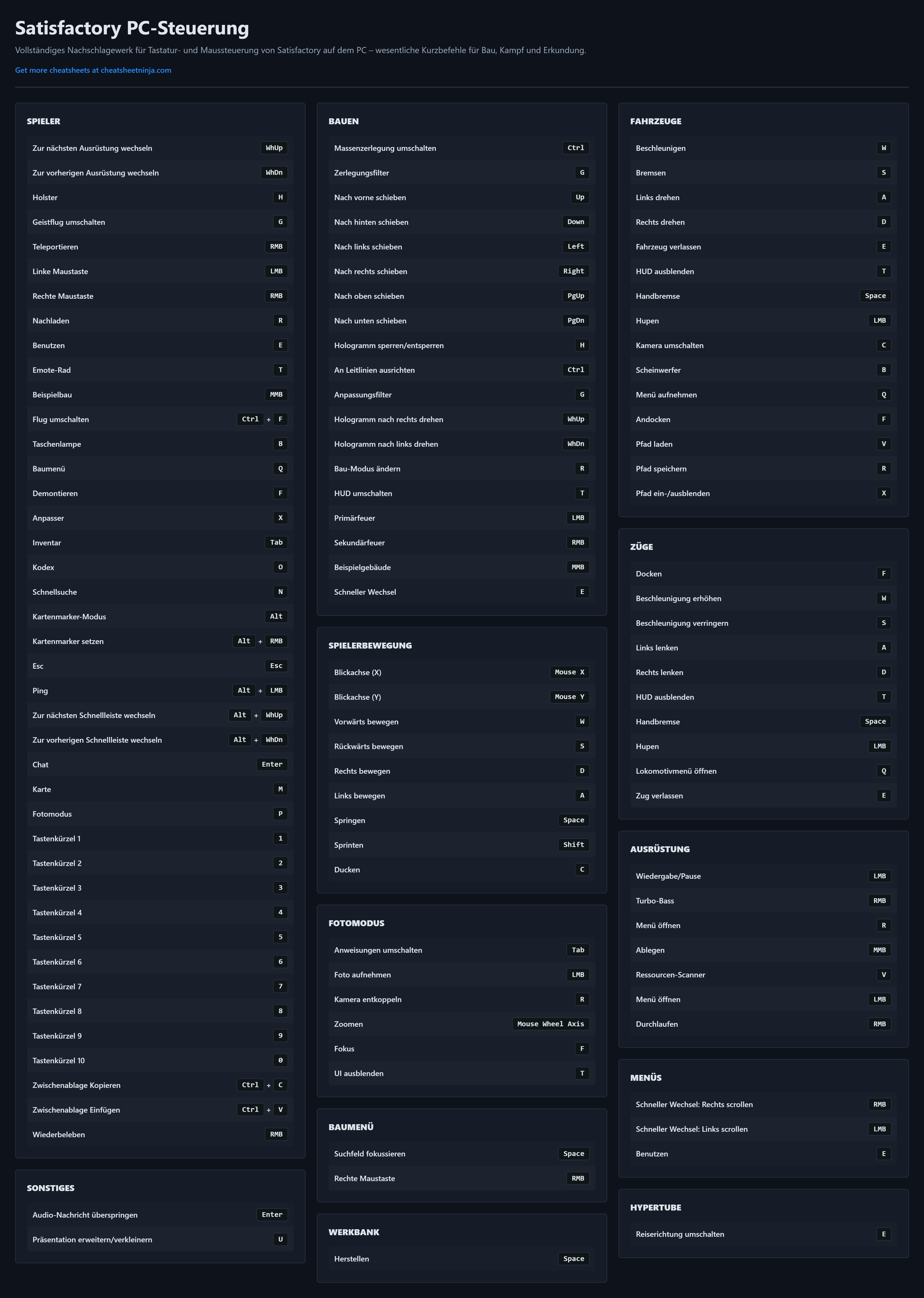 Vollständiges Nachschlagewerk für Tastatur‑ und Maussteuerung von Satisfactory auf dem PC – wesentliche Kurzbefehle für Bau, Kampf und Erkundung.
