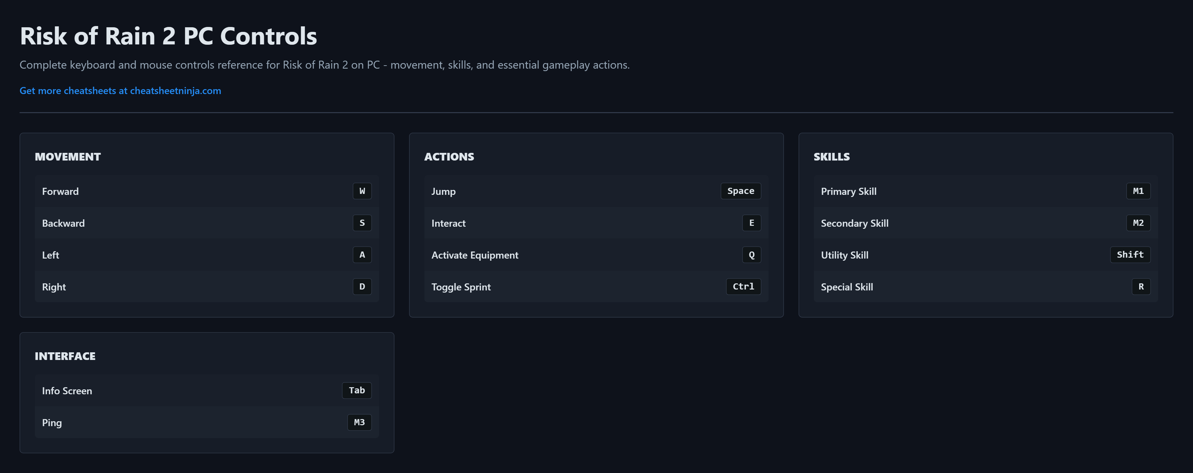 Complete keyboard and mouse controls reference for Risk of Rain 2 on PC - movement, skills, and essential gameplay actions.