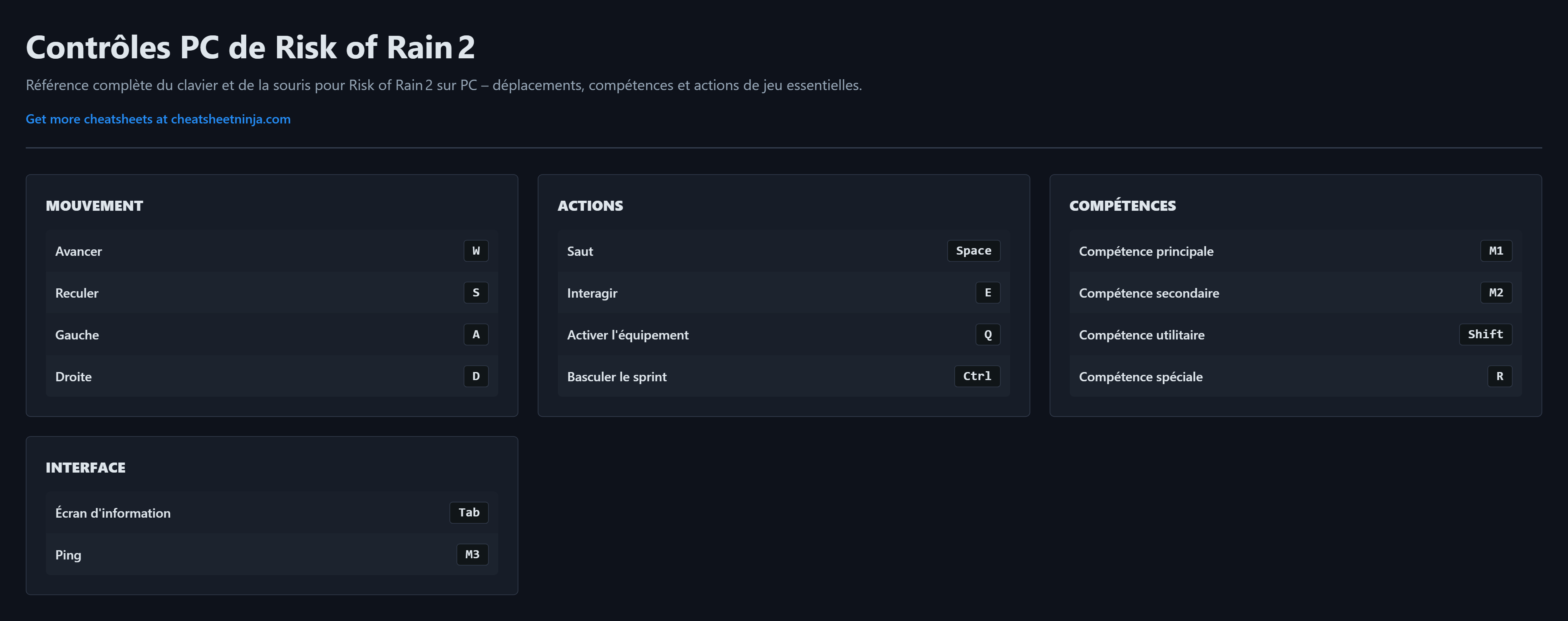 Référence complète du clavier et de la souris pour Risk of Rain 2 sur PC – déplacements, compétences et actions de jeu essentielles.