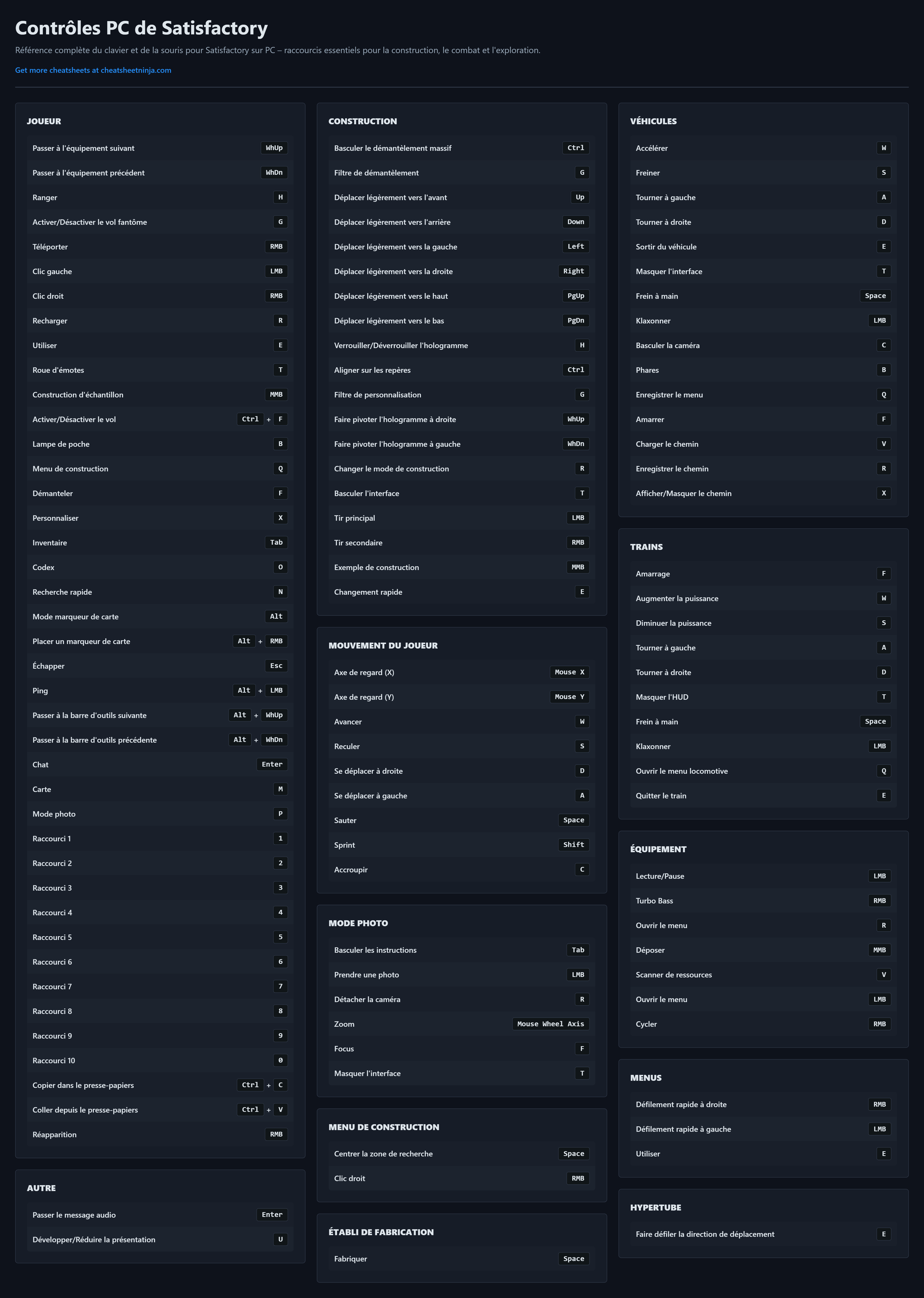 Référence complète du clavier et de la souris pour Satisfactory sur PC – raccourcis essentiels pour la construction, le combat et l'exploration.