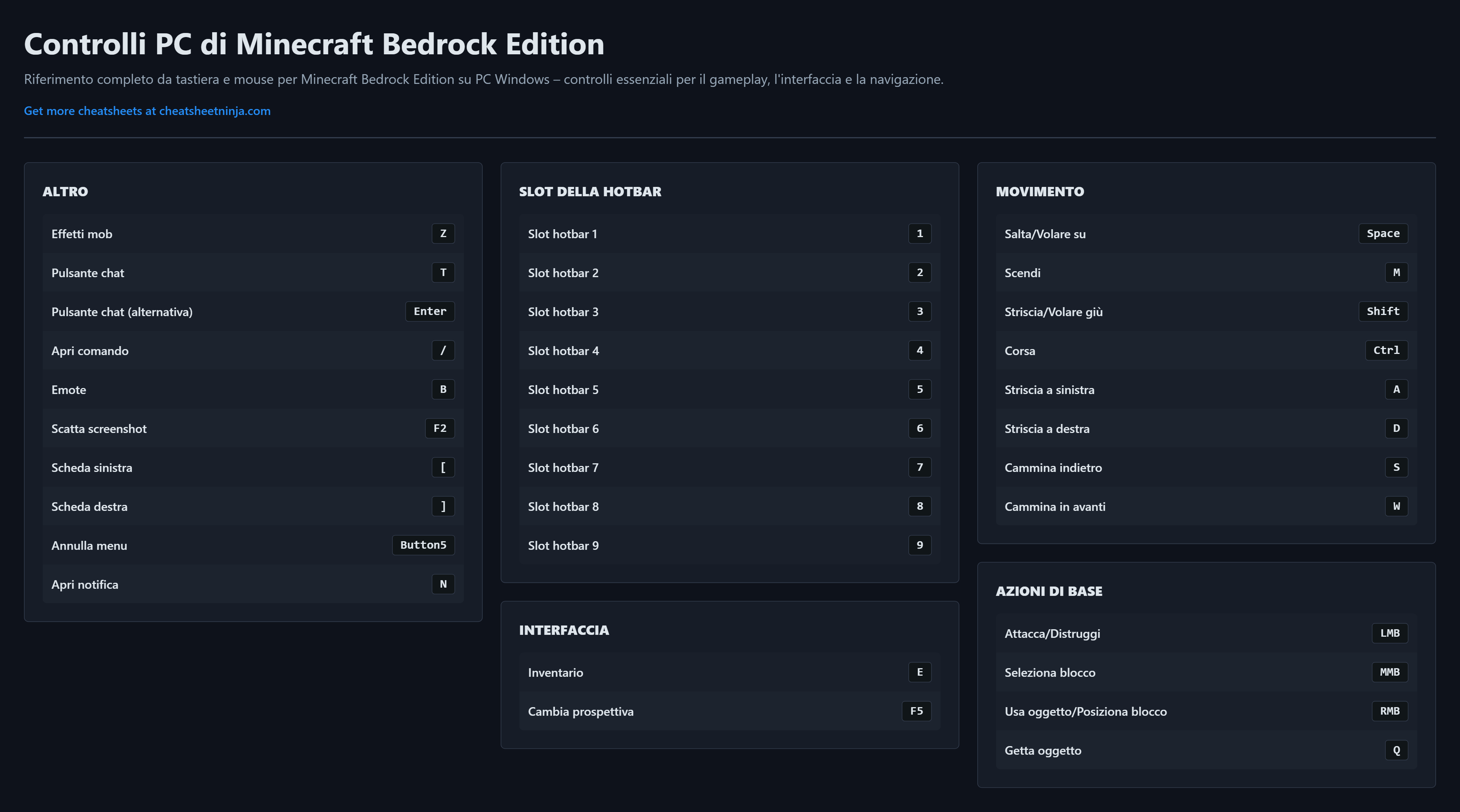 Riferimento completo da tastiera e mouse per Minecraft Bedrock Edition su PC Windows – controlli essenziali per il gameplay, l'interfaccia e la navigazione.