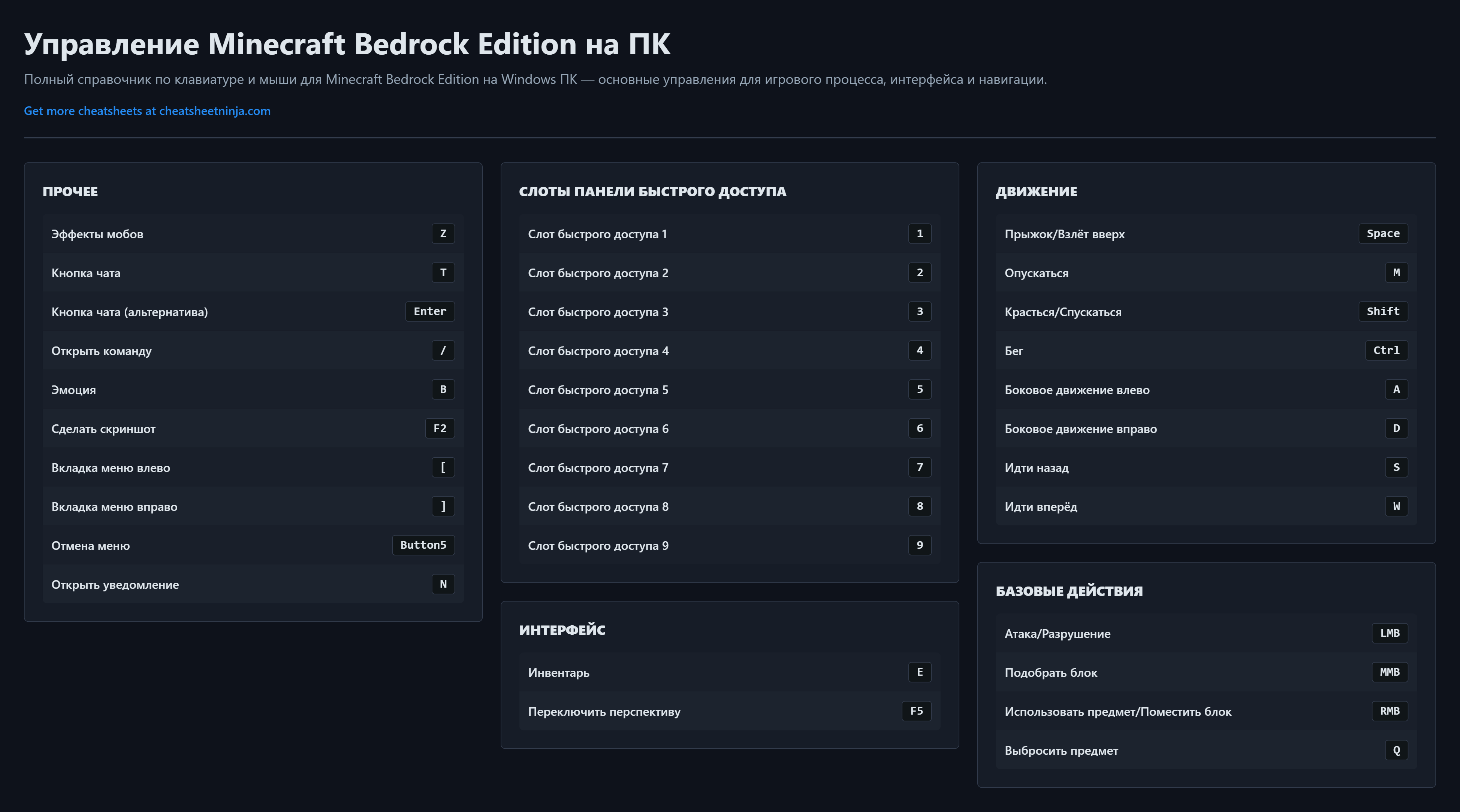 Полный справочник по клавиатуре и мыши для Minecraft Bedrock Edition на Windows ПК — основные управления для игрового процесса, интерфейса и навигации.