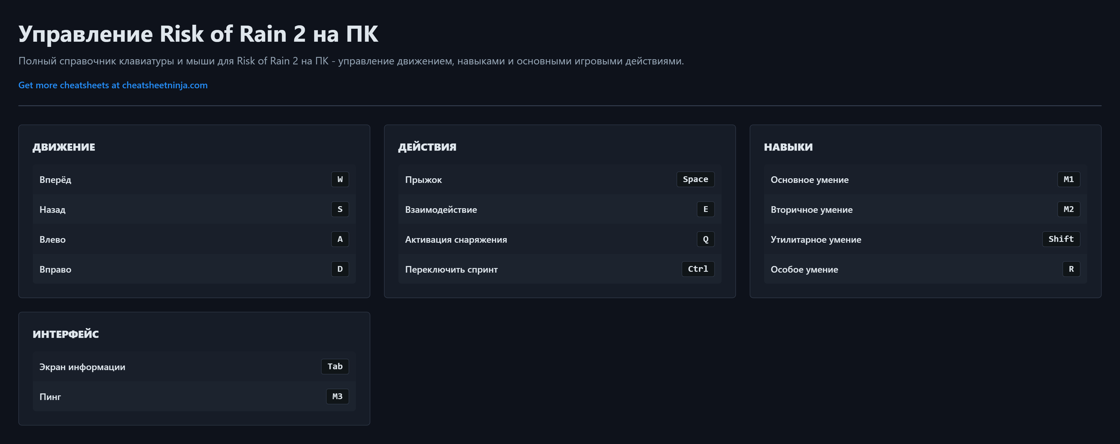 Полный справочник клавиатуры и мыши для Risk of Rain 2 на ПК - управление движением, навыками и основными игровыми действиями.